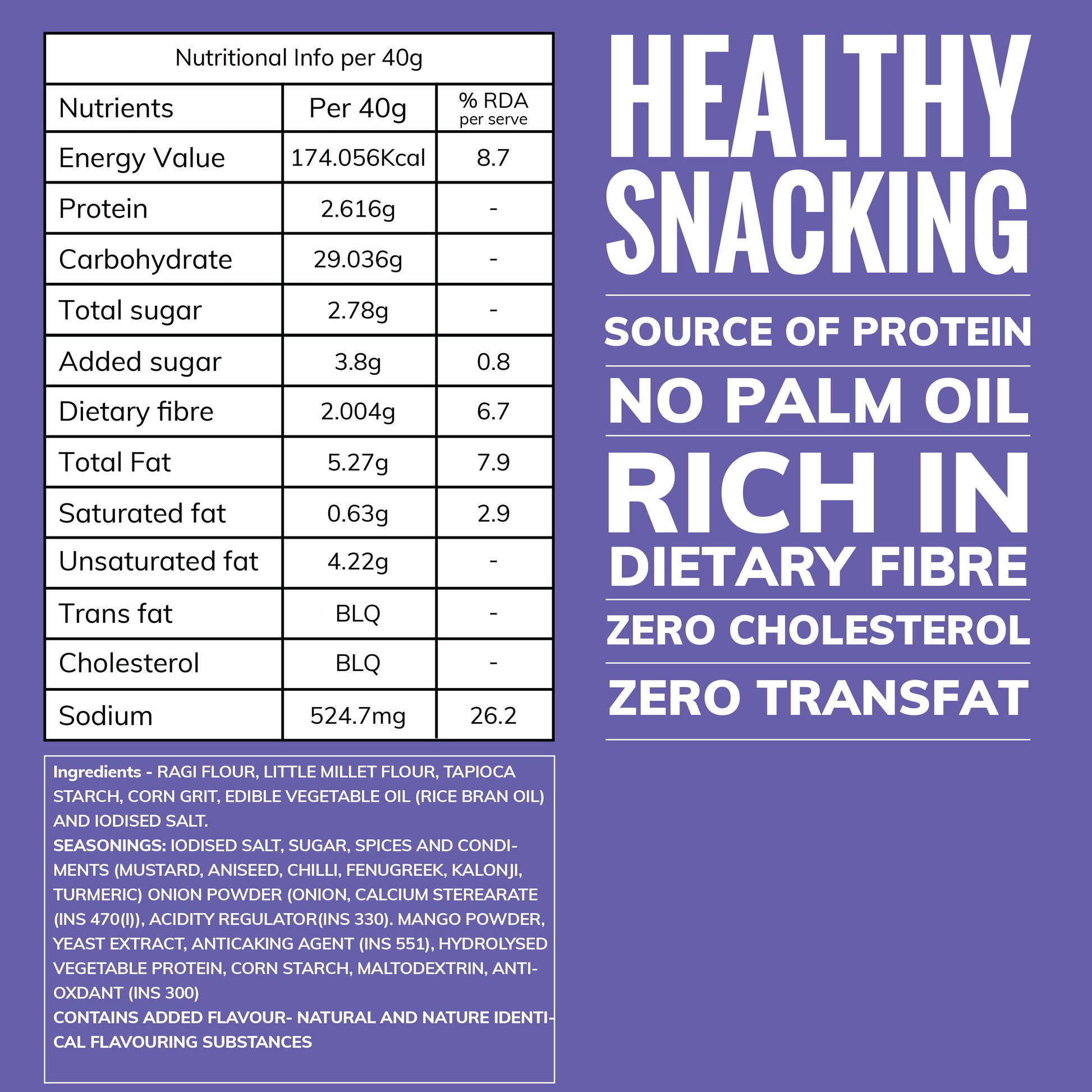 Ingredient List: Ragi flour, little millet flour, tapioca starch, corn grit, rice bran oil and iodised salt. Seasonings: Iodised salt, sugar, spices and condiments (mustard, aniseed, chilli, fenugreek, kalonji, turmeric) onion powder(onion, calcium stearate (INS 470(i)), acidity regulator(INS 330). mango powder, yeast extract, anticaking agent (INS 551), hydrolysed vegetable protein, corn starch, maltodextrin, and antioxidants (INS 300). Contains added flavour- Natural and Nature identical flavouring substances