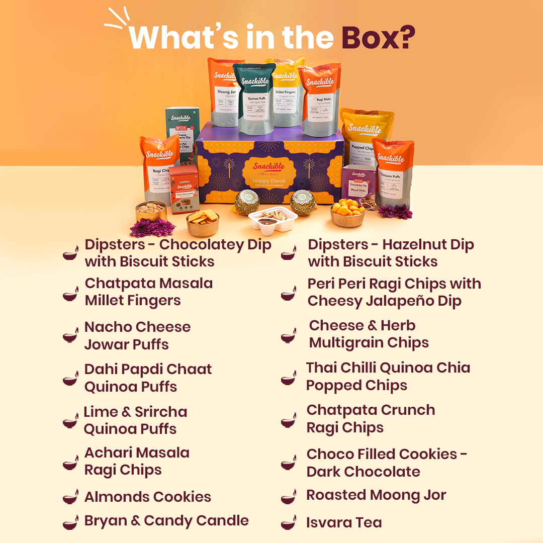 This Diwali, go big with Snackible’s Diwali Bada Dhamaka Hamper, a festive delight in every bite. Packed with 14 bestselling snacks, it’s a mix of sweet, savoury, and everything in between. From the fiery crunch of Achari Masala Ragi Sticks and Chatpata Masala Millet Fingers to indulgent Choco-Filled Dark Chocolate Cookies and Hazelnut Dipsters, this hamper is made to light up every celebration.