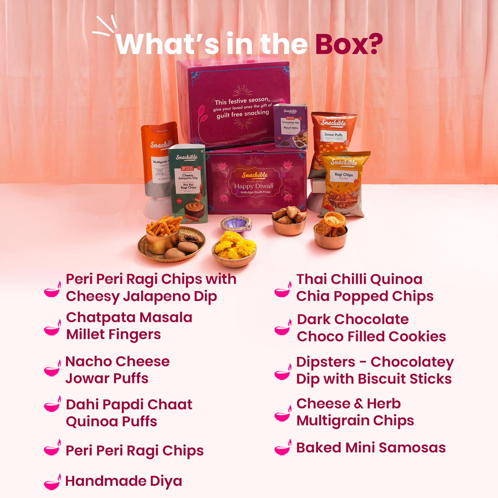 Celebrate a mu(n)ch better Diwali with Snackible’s Diwali Masti Hamper, the perfect gift for your loved ones. Thoughtfully packed with health and flavour, this hamper brings festive cheer in every bite. From the crunch of Peri Peri Ragi Chips and Chatpata Masala Millet Fingers to the indulgence of Choco-Filled Dark Chocolate Cookies and Chocolate Dipsters, there’s a treat for every craving.