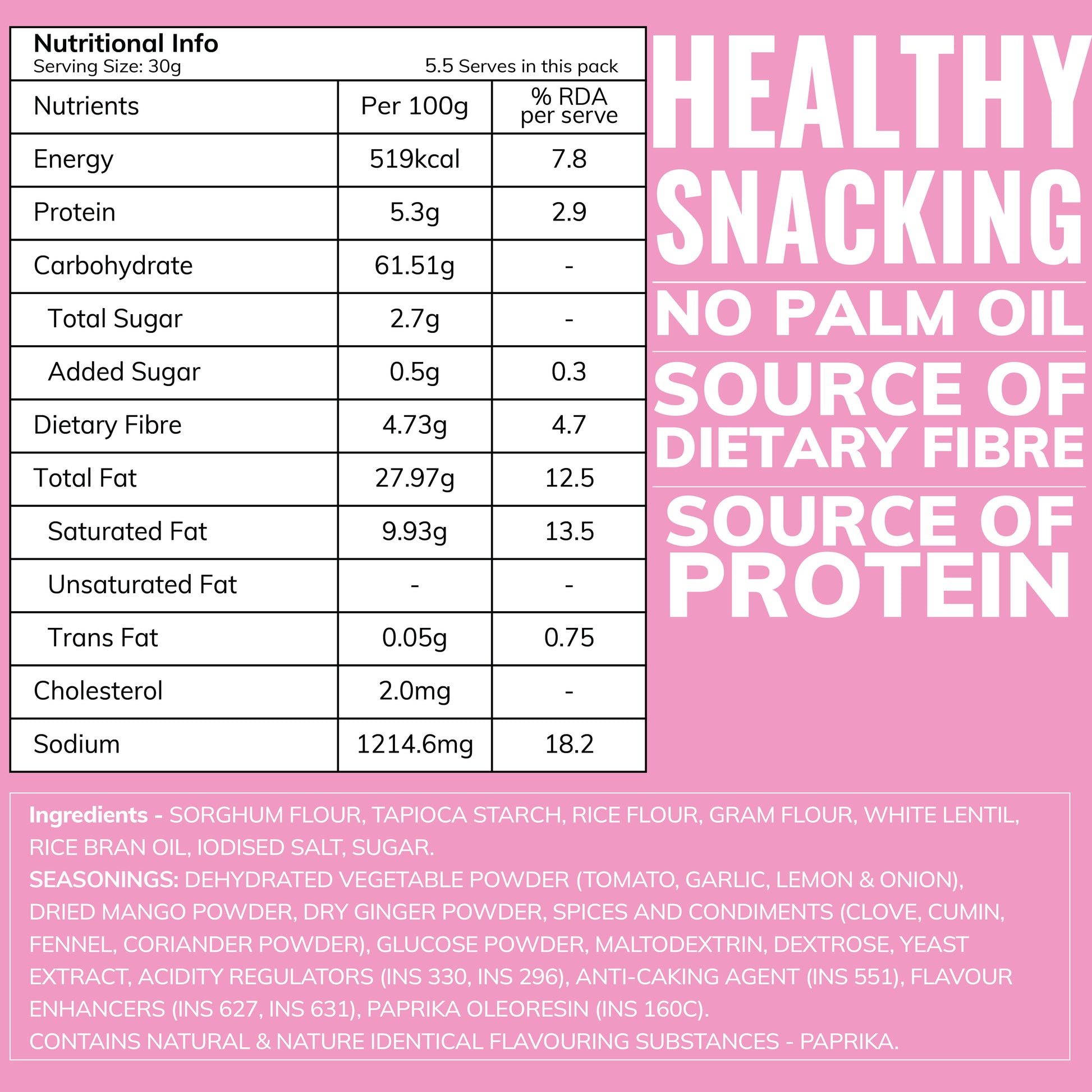 When your cravings call for something truly desi, Chatpata Masala Jowar Chips answer them loud and clear. Packed with our signature blend of Indian spices, these chips bring the perfect balance of heat, tang, and that unmistakable chatpata kick. The high-protein jowar base delivers a crunchy bite that keeps you coming back for more, while zero palm oil means you can snack without second thoughts. Perfect for moments that demand real flavour, this is masaledaar snacking that keeps up.