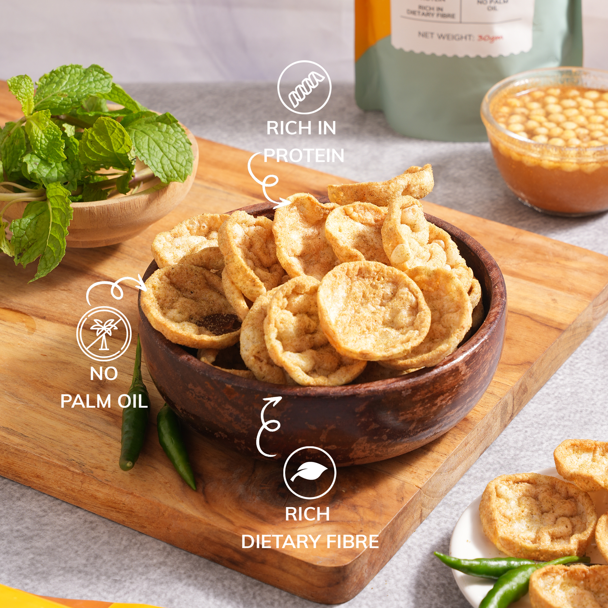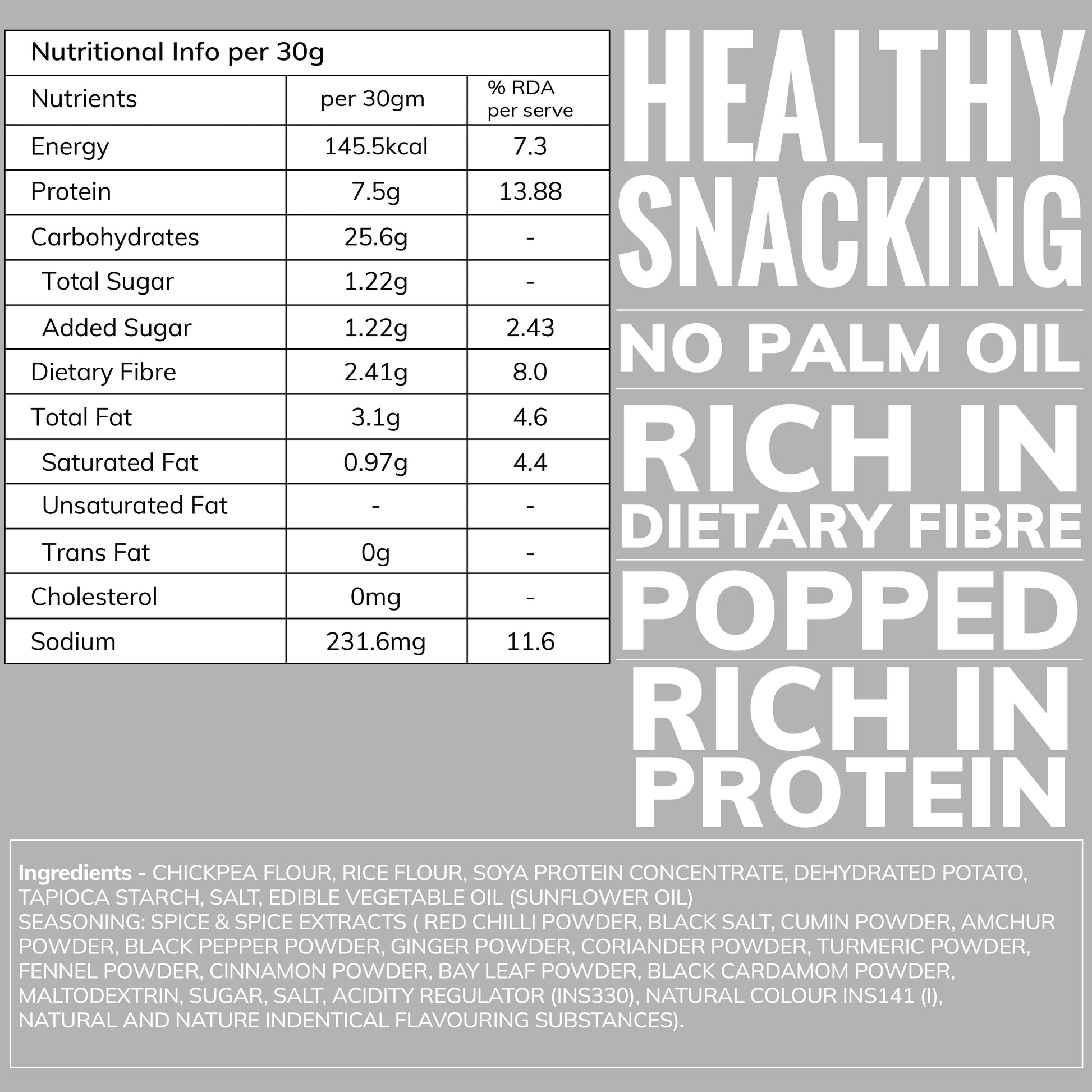 Pop your way into completing your protein goals for the day with our Pani Puri Protein Popped Chips. Packed with the authentic flavours of Pani Puri, each serving delivers a tasty 25% protein boost at just 145 calories. Our Pani Puri Protein Popped Chips bring the flavour without the guilt. They’re high in protein and fibre, plus free of junk like palm oil.