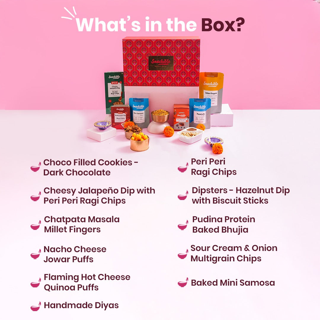 Spark joy this Diwali with Snackible’s Mu(n)ch Better Hamper. Specially curated 10 sweet and savoury delights, it’s the perfect gift for your loved ones. From the fiery crunch of Peri Peri Ragi Chips and Flaming Hot Cheese Quinoa Puffs to indulgent Choco-Filled Dark Chocolate Cookies and creamy Hazelnut Dipsters, there’s a treat for every craving.