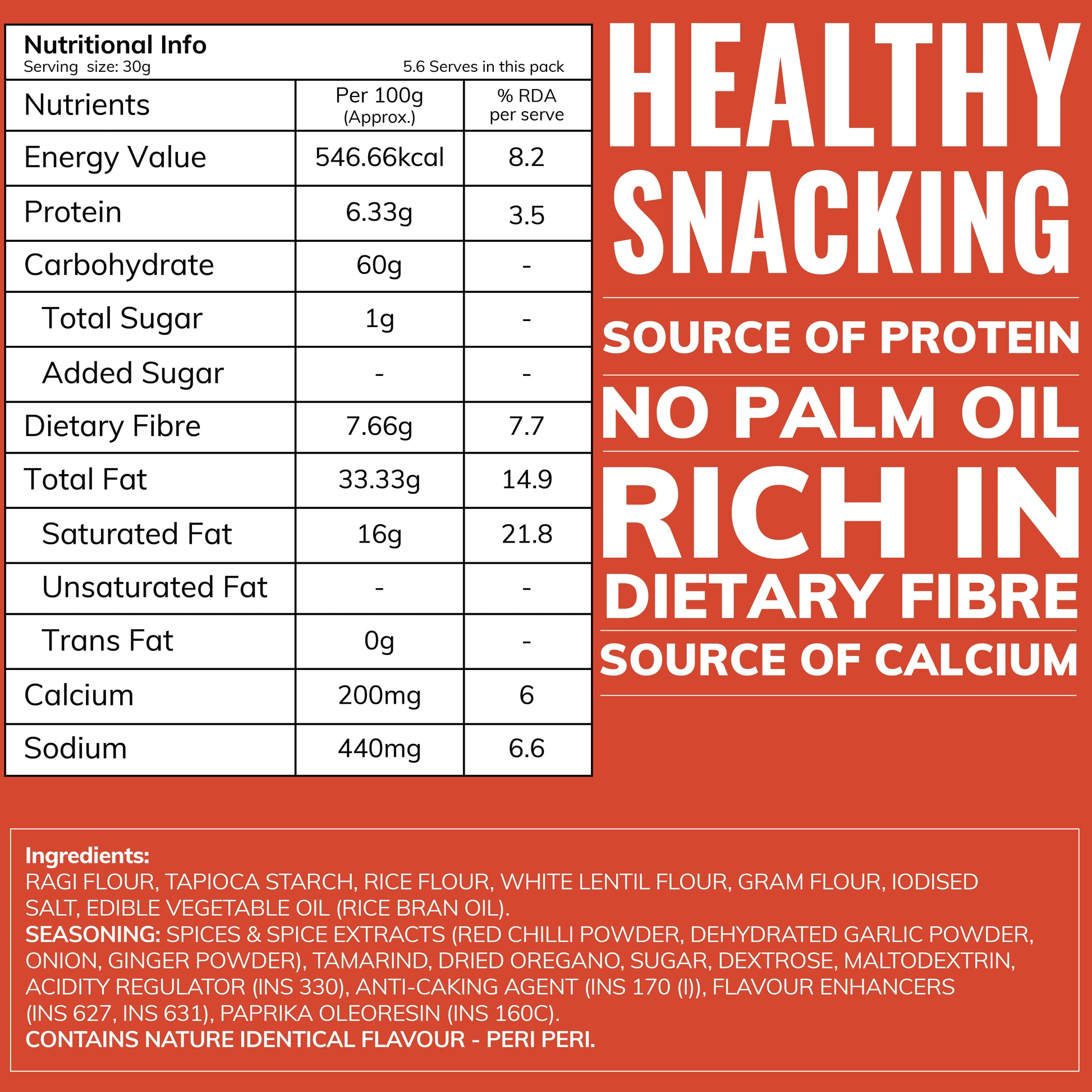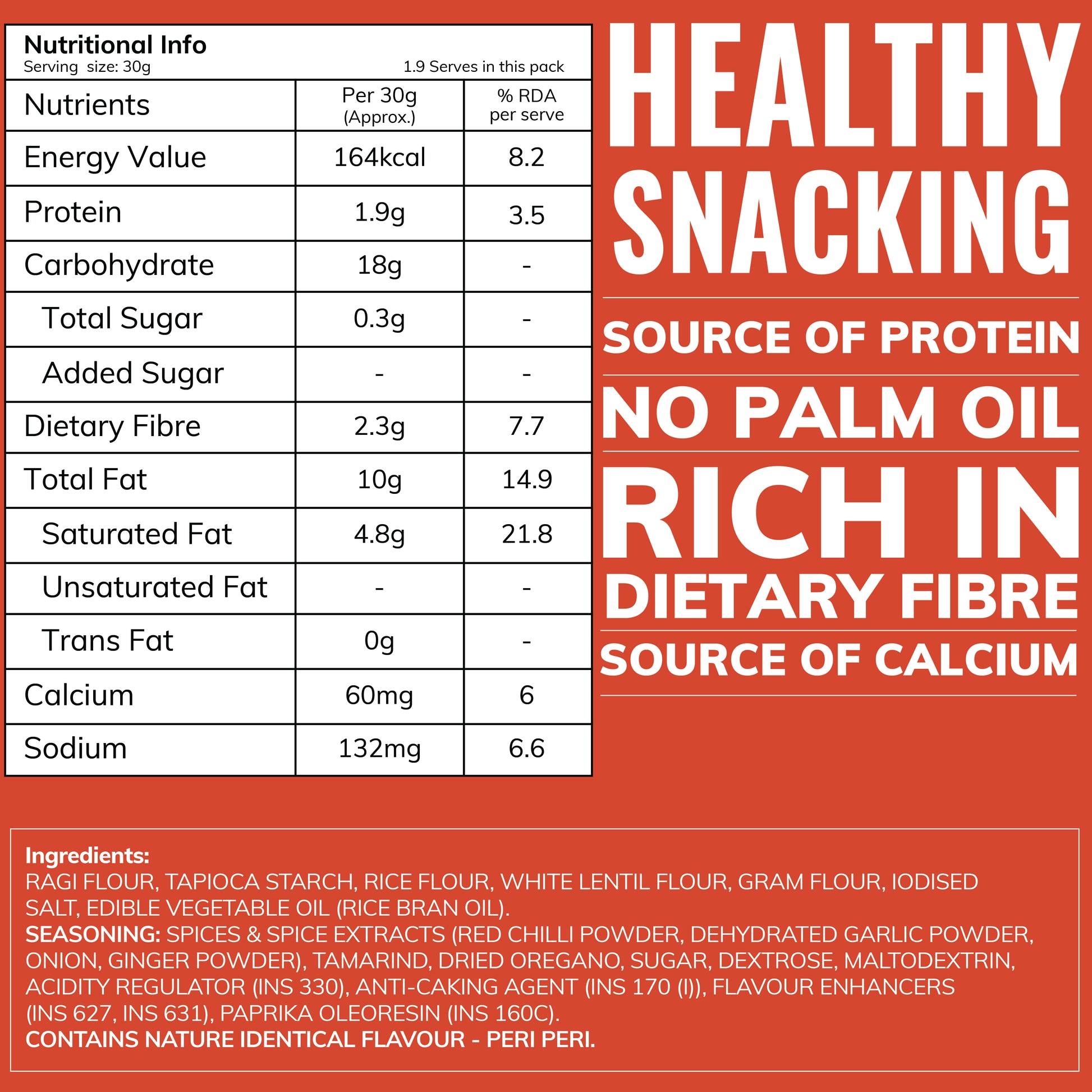 Here's a crispy snack made with the goodness of ragi! This snack is perfect for those laid-back evenings, with a chilled drink in hand! There's another thing we can assure: with its crunchy texture and unmistakable flavour of Peri-Peri, this snack is truly addictive.