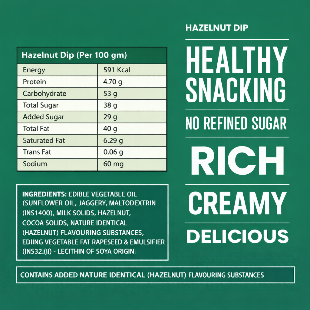 Hazelnut Spread: Edible vegetable oil (sunflower oil), jaggery, maltodextrin (INS1400), milk solids, hazelnut, cocoa solids, nature identical (hazelnut) flavouring substances, edible vegetable fat (rapeseed) & emulsifier (INS322(i)- lecithin of soya origin)