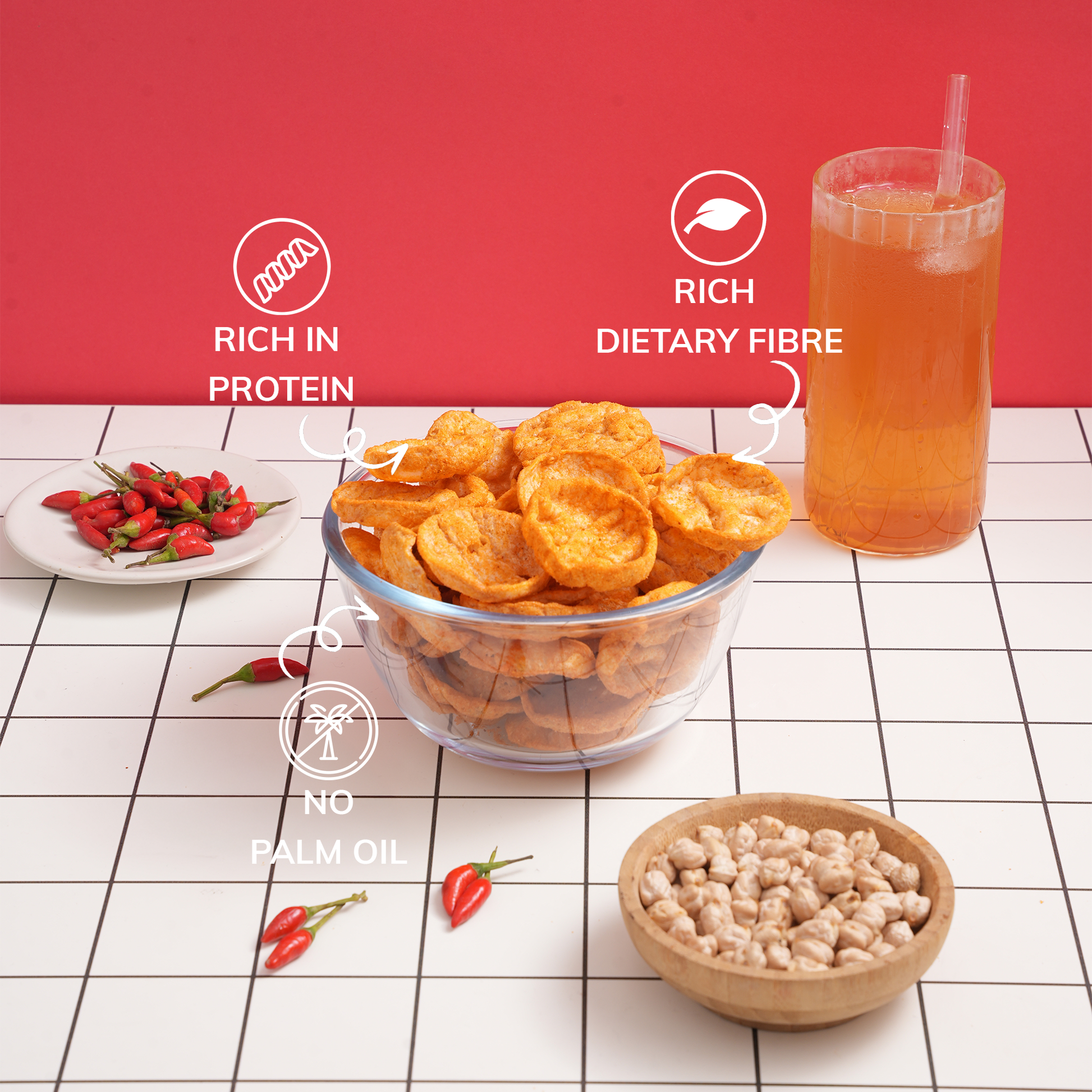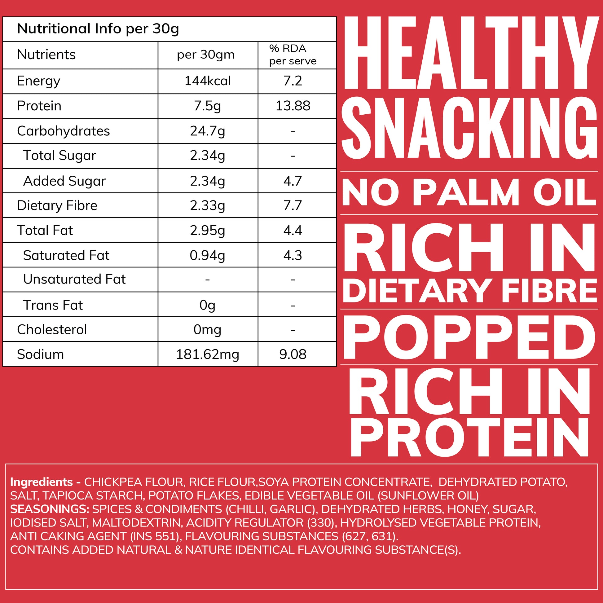 Pop your way into completing your protein goals for the day with our Thai Chilli Protein Popped Chips. Packed with the heat of Thai Chilli, each serving delivers a tasty 25% protein boost at just 144 calories. Our Thai Chilli Protein Popped Chips bring the flavour without the guilt. They’re high in protein and fibre, plus free of junk like palm oil.