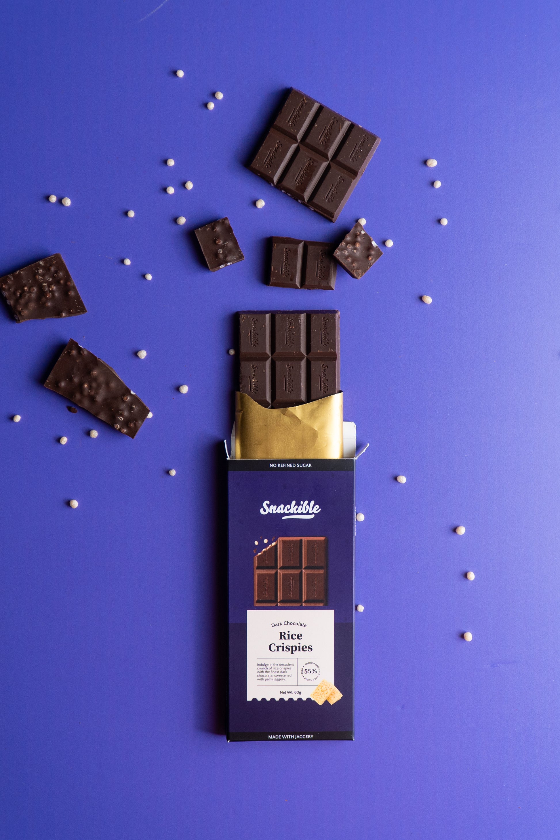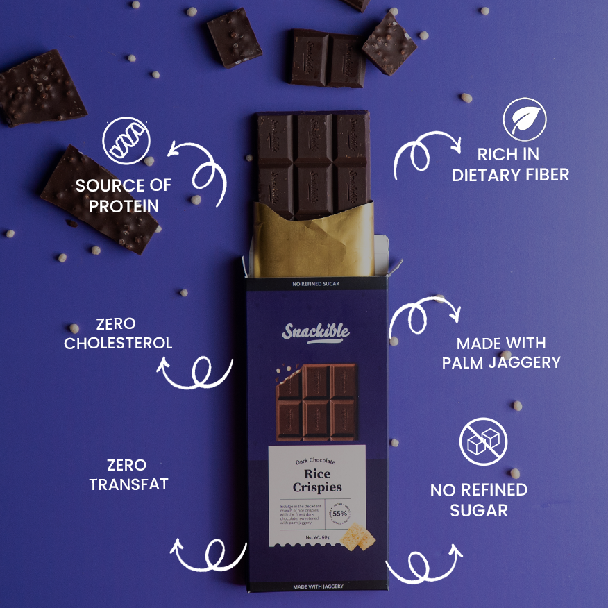 Welcome to the world of guilt-free indulgence with Snackible's Rice Crispies Chocolate made with no refined sugar! Our chocolate bar is crafted with high-quality cocoa beans, cocoa butter, and sweetened using palm jaggery. It's packed with dietary fiber and protein, making it a healthier choice for satiating your sweet tooth.