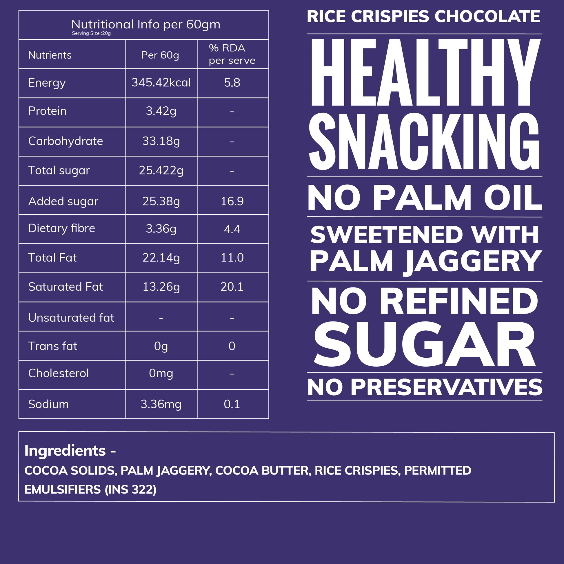 Ingredients List: Cocoa solids, palm jaggery, cocoa butter, rice crispies, permitted emulsifiers (322).