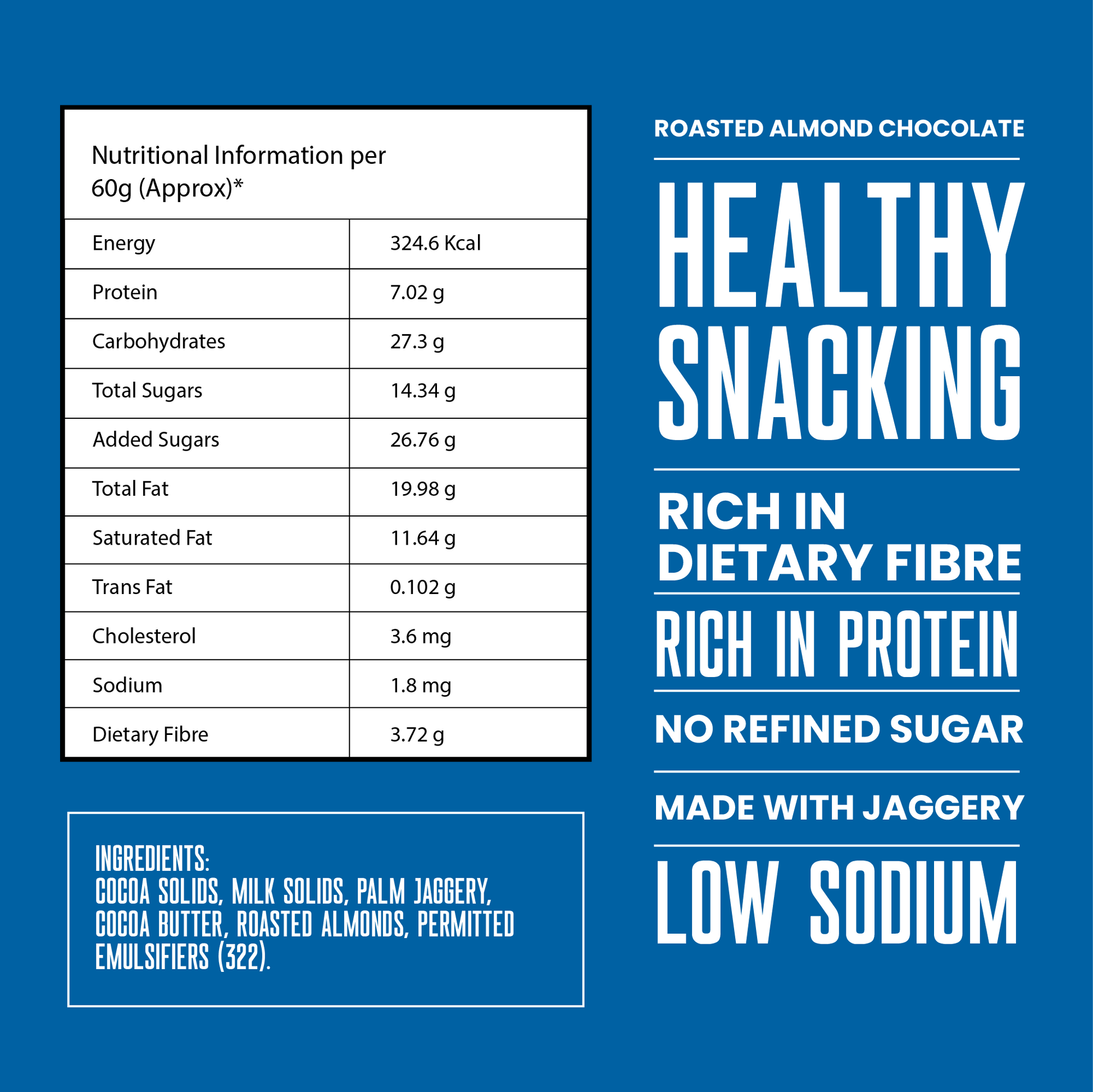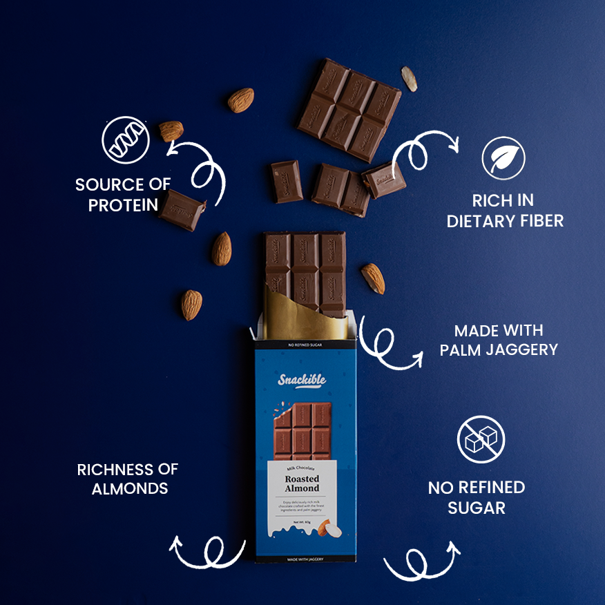 Welcome to the world of guilt-free indulgence with Snackible's Roasted Almond Chocolate made with no refined sugar! Our chocolate bar is crafted with high-quality roasted almonds, cocoa beans, cocoa butter, and sweetened using palm jaggery. It's packed with dietary fiber and protein, making it a healthier choice for satiating your sweet tooth.