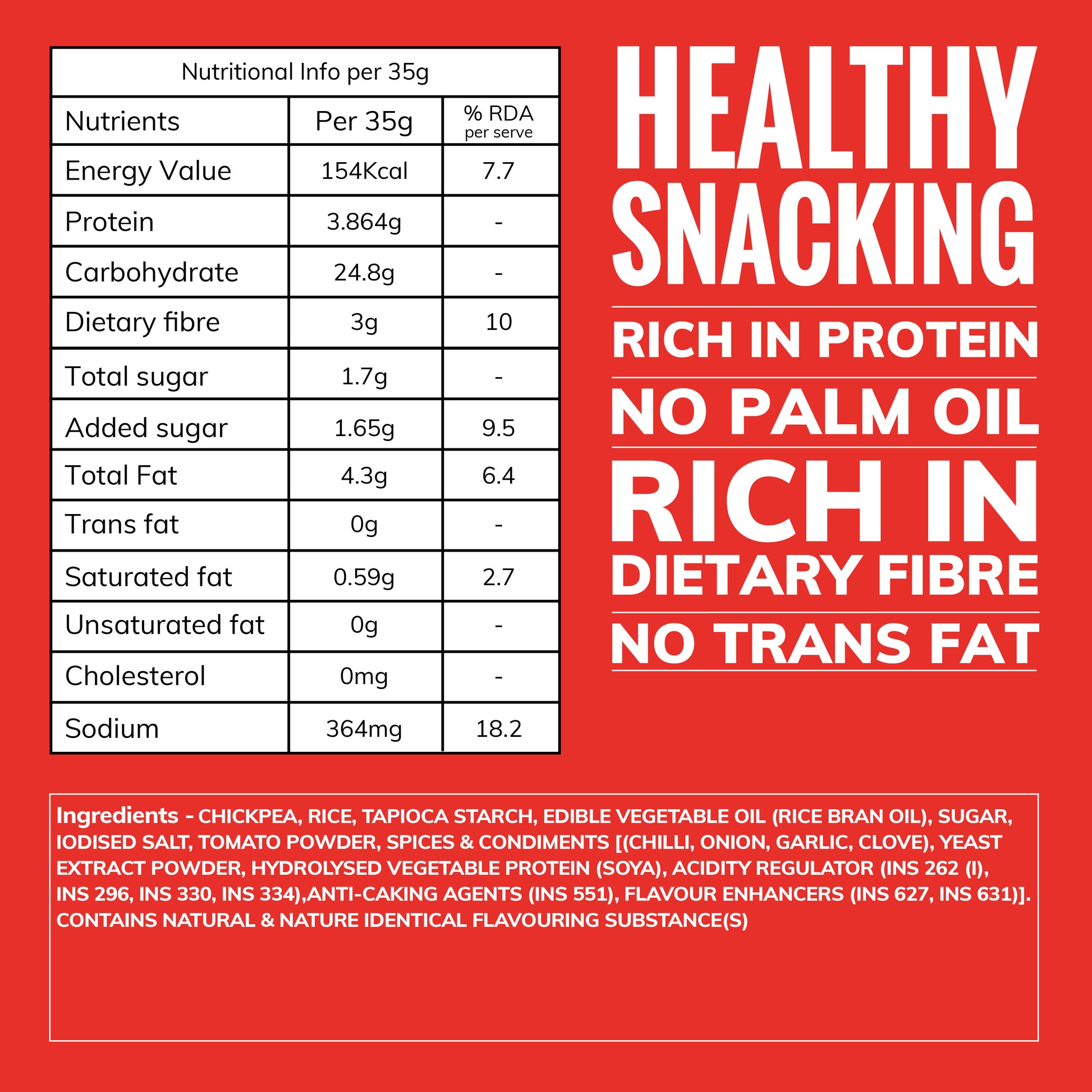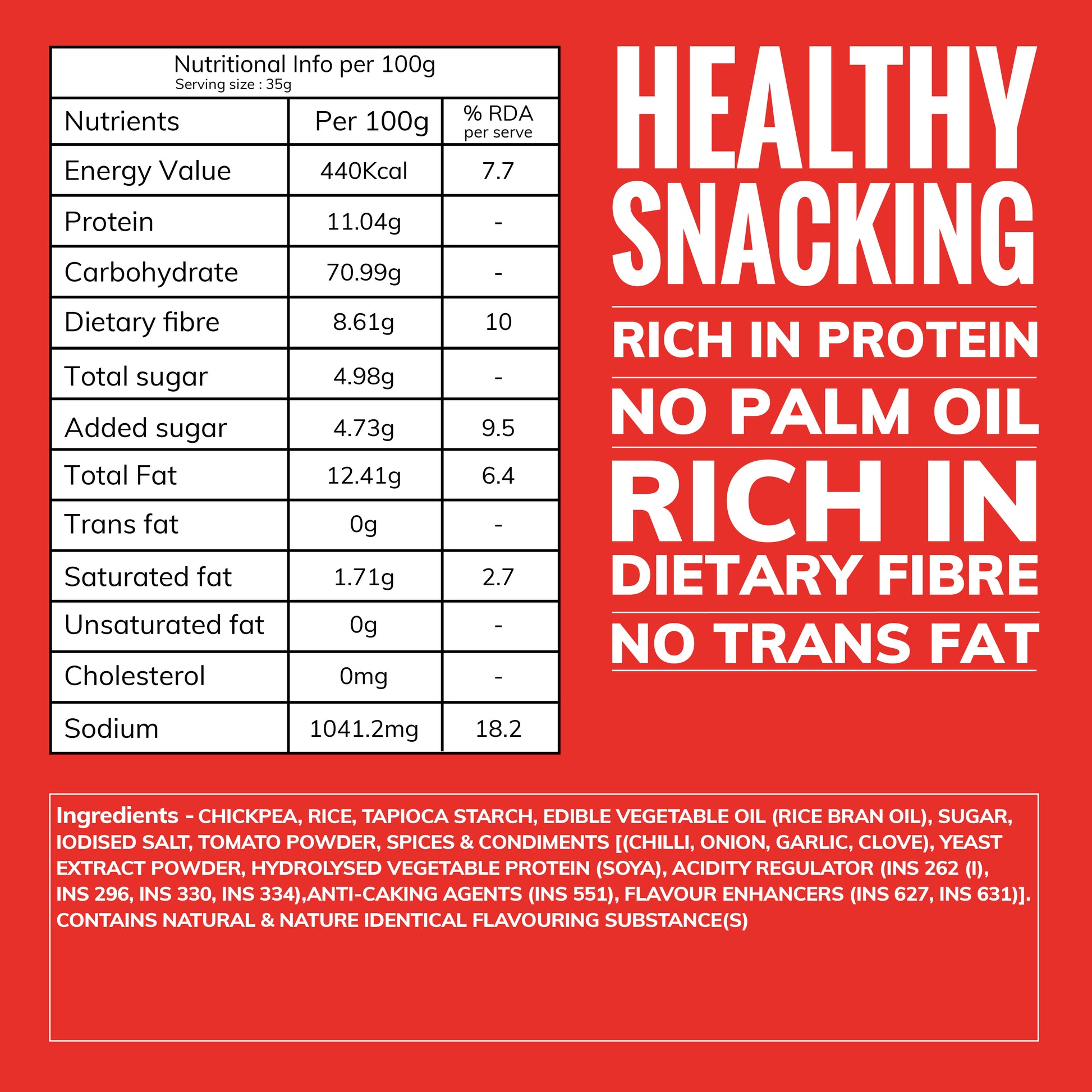 Chickpeas, Rice, Tapioca Starch, Edible Vegetable Oil (Rice Bran Oil)l, Sugar, Iodised Salt, Tomato Powder, Spices & Condiments (Chilli, Onion, Garlic, Clove), Yeast Extract Powder, Hydrolysed Vegetable Protein (Soya Based), Acidity Regulator (INS 262 (i), INS 296, INS 330, INS 334), Natural & Nature Identical Flavouring Substances, Anti-caking agents (INS 551), Flavour Enhancers (INS 627, INS 631).