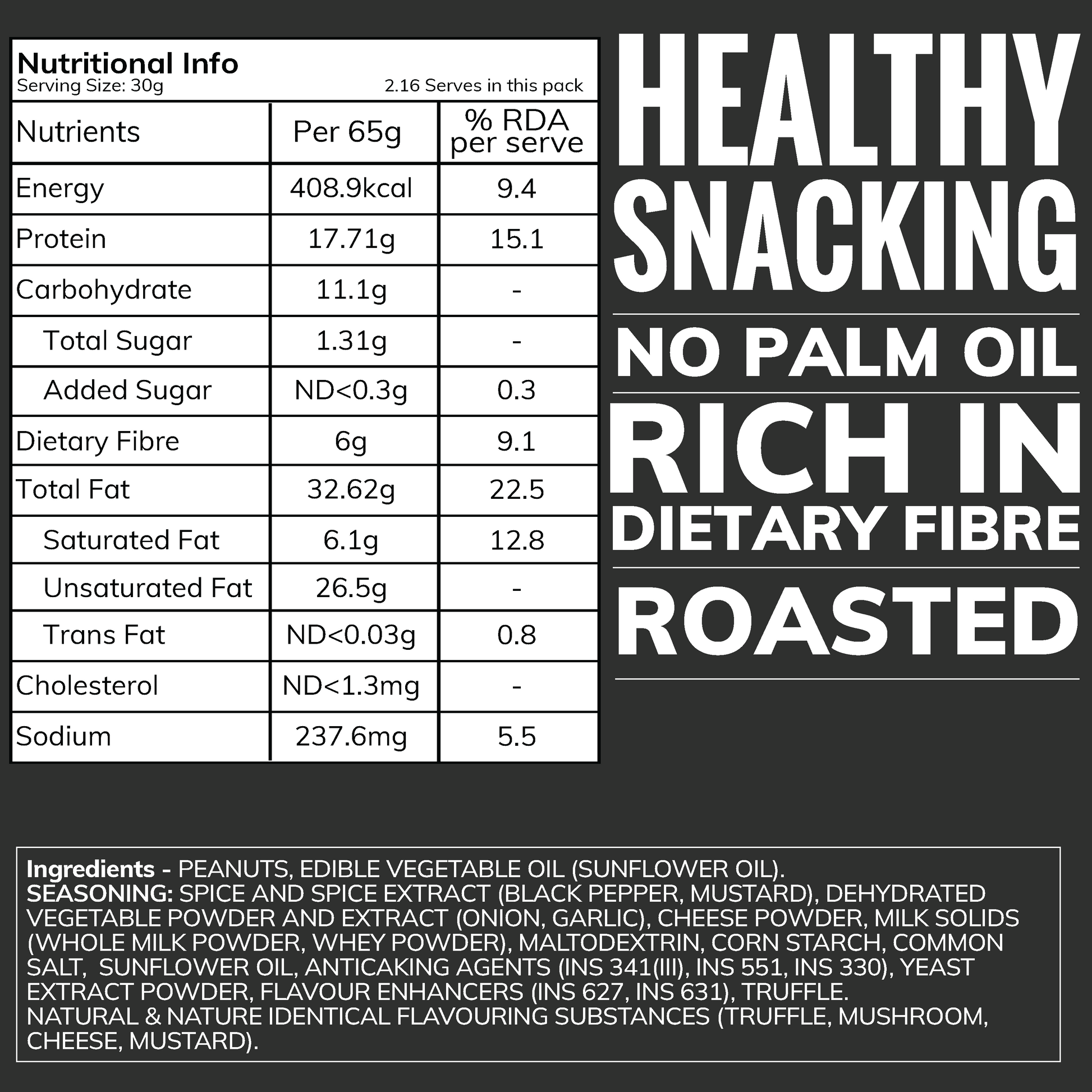 Seasoning: Maltodextrin, corn starch, common salt, cheese powder, milk solids (whole milk powder, whey powder), spice and spice extract (black pepper, mustard), dehydrated vegetable powder and extract (onion, garlic), sunflower oil, anticaking agent (INS 341(iii), INS 551, INS 330), yeast extract powder, flavour enhancers (INS 627, INS 631), truffle.